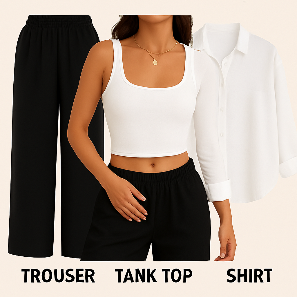 Discover a new level of ease and elegance with the Everyday Comfort Co-Ord Set – designed for the modern woman who values comfort without compromising on style. This 3-piece set features a premium ribbed tank top, a soft oversized shirt, and relaxed-fit trousers – a timeless trio that offers endless styling possibilities.